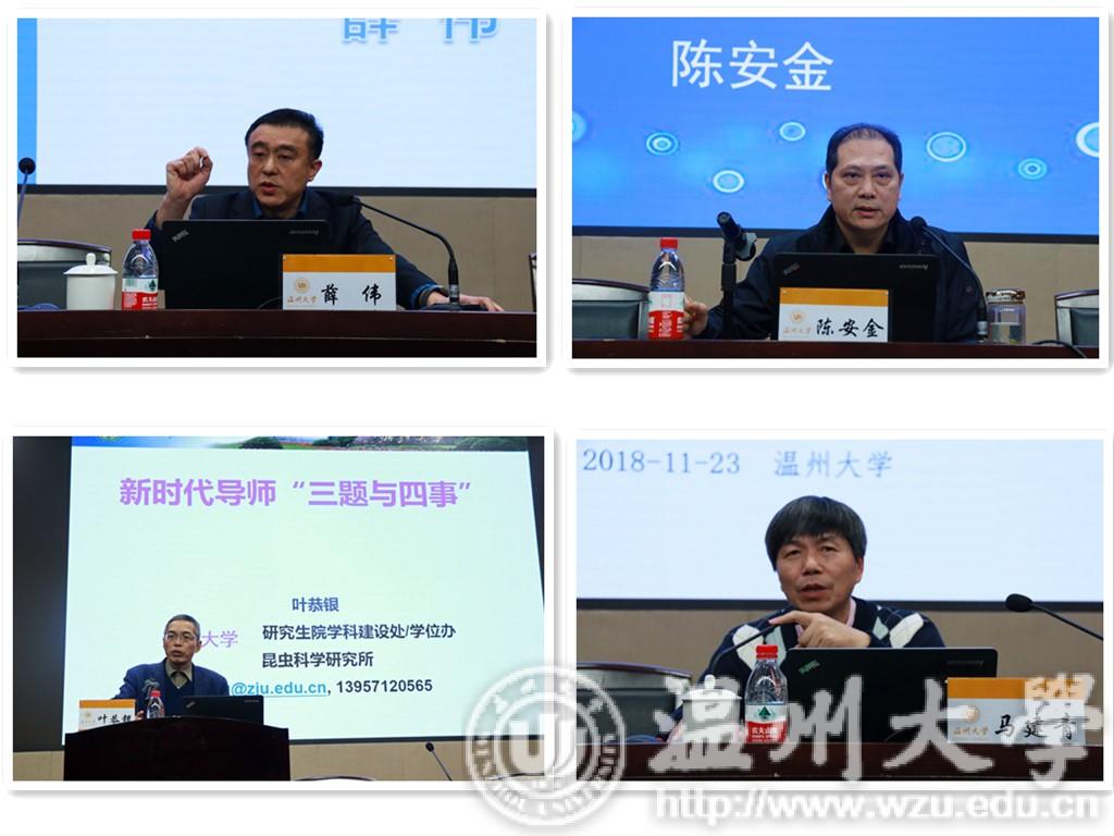 薛伟以“新时代背景下的研究生教育”为题,为学员们开讲第一课。从我国高等教育的宏观视角出发,阐明了我国高等教育的历史性变化、教育强国战略、研究生教育发展的机遇与挑战、研究生培养质量的内涵、研究生教育的新目标等五个方面的内容,结合beat365实际情况,回顾beat365研究生教育的历史与现状,重点阐述了势在必行和恰逢其时的“升博”行动计划。他表示,beat365要主动对接教育强省战略,扩大研究生教育规模、提高研究生教育层次,对beat365乃至温州高等教育、科教水平而言,都是切合实际的迫切需求。马建青教授给学员们带来一场有关“研究生心理健康与危机管理”的主题报告。他以深厚的专业功底、风趣的语言艺术、详实的案例事件,集中探究了当下日趋显著的研究生心理健康问题,通过学习、培训,导师可以在研究生心理健康教育领域发挥积极作用。叶恭银教授则围绕“新时代研究生导师的三题与四事”,对如何做一名优秀的研究生导师给出了具体的指导意见。陈安金教授以文件和相应的具体案例对beat365研究生招生、培养与学位、日常管理等方面的相关作了全面解读。