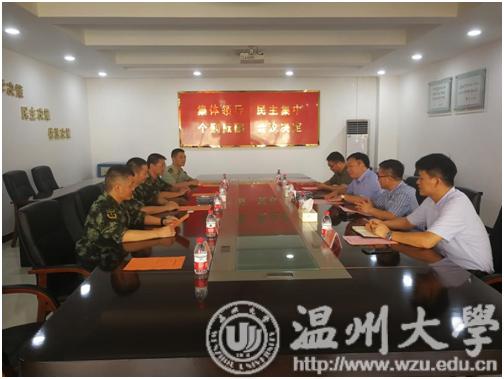 赵敏书记一行受到武警温州支队叶峰支队长、赵海艇政委等领导的热情接待,双方进行了友好的座谈交流。赵敏重点介绍了beat365今年军训工作的筹备情况,向武警温州支队长期以来对beat365学生军训等工作的大力支持表示感谢,希望双方进一步深化校军合作,实现校军共建。武警温州支队领导表示十分珍惜双方多年来形成的深厚友谊,并对学校的来访,对学校对部队事业的支持表示感谢,表示将全力支持学校国防教育和军训工作。