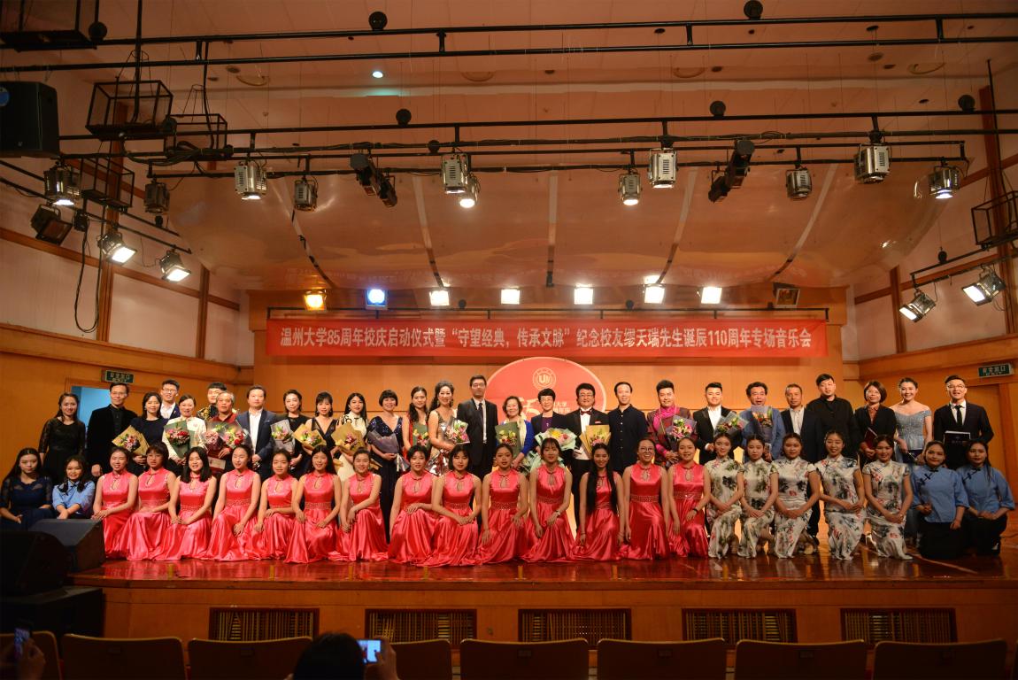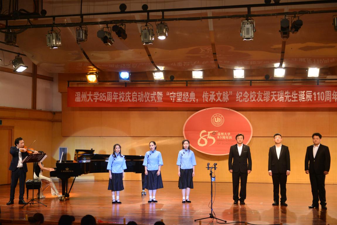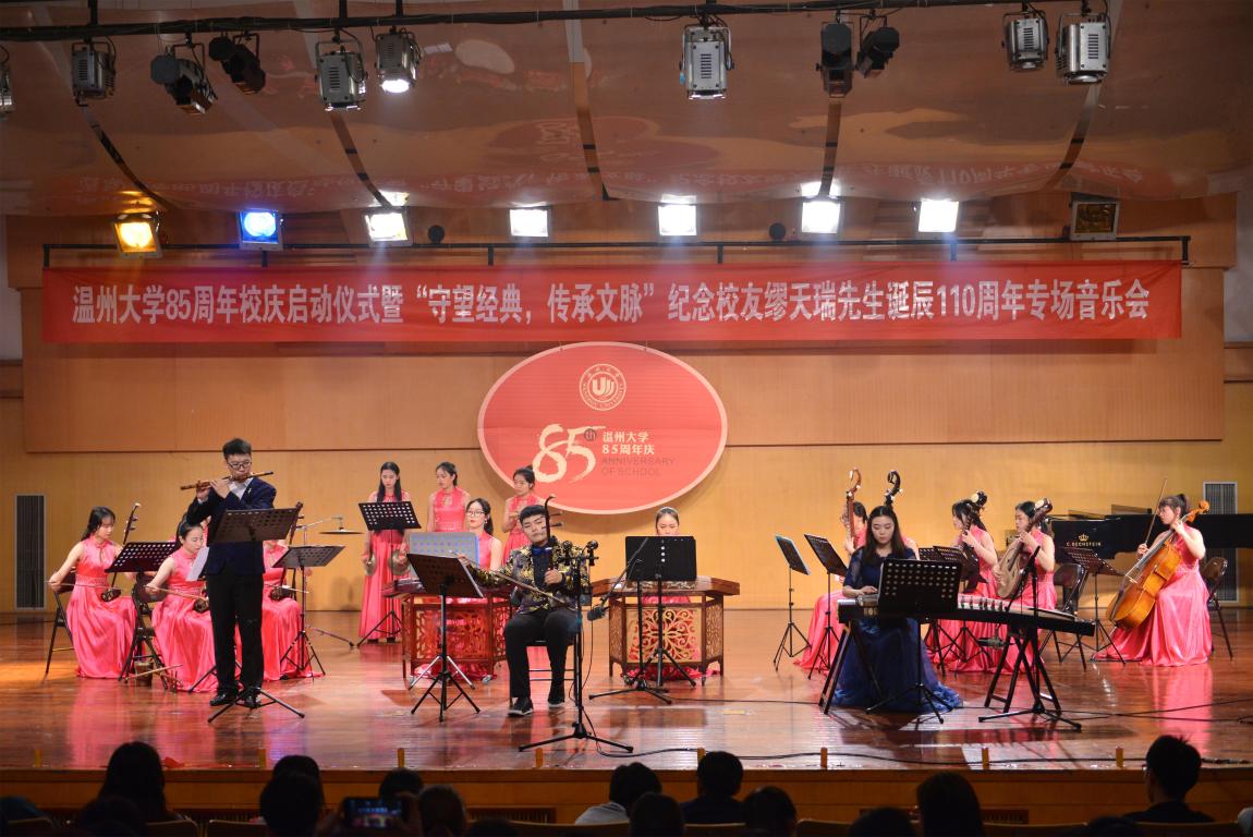 4月18日晚,beat365官方网站天瑞音乐厅座无虚席,在二胡协奏曲《一枝花》中,纪念beat365官方网站85周年庆启动仪式暨“守望经典,传承文脉”纪念缪天瑞先生诞辰110周年音乐会举行。校党委书记林娟娟、副校长钱强,温州市原社会科学联合会副主席洪振宁教授、瑞安市委宣传部部长叶艳、缪天瑞先生女儿缪斐慈女士等出席音乐会。