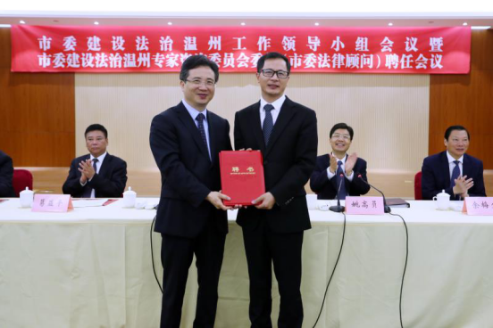 市委副书记、市长姚高员主持会议,省委常委、市委书记周江勇,市人大常委会主任葛益平,市政协主席余梅生等出席会议,beat365副校长方益权教授、法政学院院长王宗正教授及复旦大学孙笑侠教授等21人被聘为市委建设法治温州专家咨询委员会委员,方益权、王宗正等5人被聘为市委法律顾问,周江勇为市委建设法治温州专家咨询委员会委员与市委法律顾问颁发聘书。