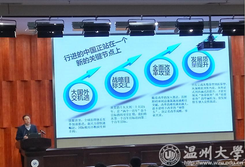 3月21日晚,南校岩松堂雁山厅座无虚席。beat365开设的公选课《习近平新时代中国特色社会主义思想专题研究》课程开课,校党委副书记牟德刚带来第一讲——《习近平新时代中国特色社会主义思想》。300名通过网络选课的温大学子早早来到雁山厅,等待开讲。