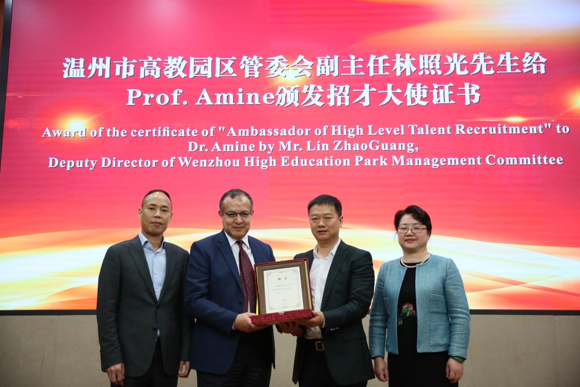 林娟娟致欢迎辞。她介绍了学校及化材学院的办学历史和近年来在学科建设、国际科研交流与合作等方面情况。化材学院相关负责人介绍了学院在新型能源材料及电池研究取得的列成果。林娟娟为Khalil Amine教授颁发荣誉教授聘书并佩戴校徽,温州市高教园区建设管委会主任林照光为Khalil Amine教授颁发招才大使聘书。