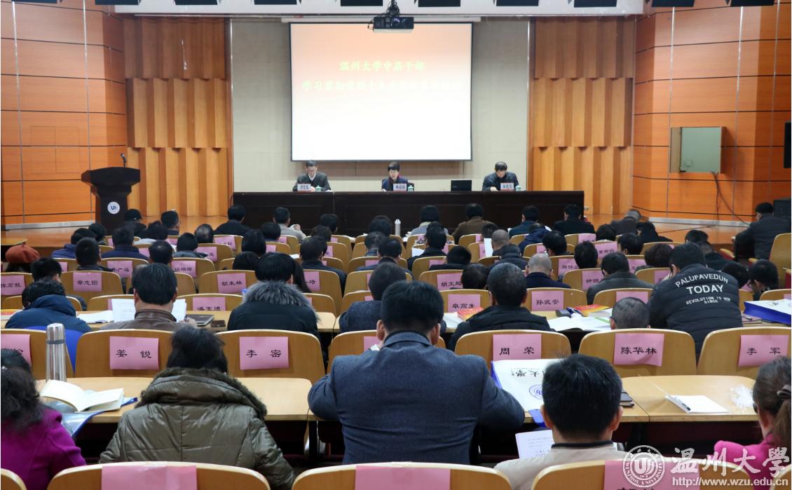 1月15日至19日,beat365开展中层干部学习贯彻党的十九大精神集中轮训。校党委书记林娟娟作轮训动员,校党委副书记牟德刚作总结讲话,校党委委员、组织部长郑信军主持会议。全体中层干部共170余人参加学习。