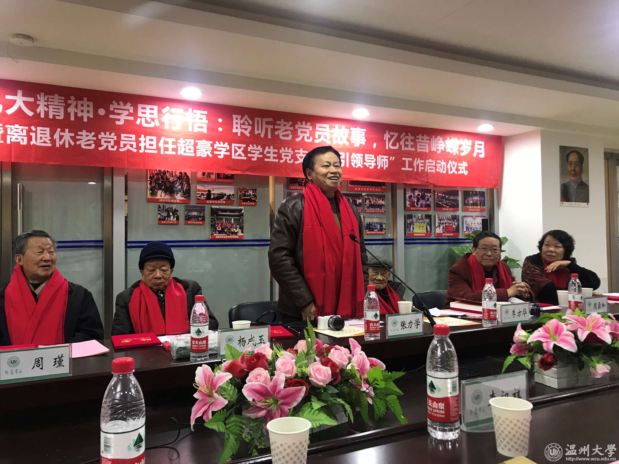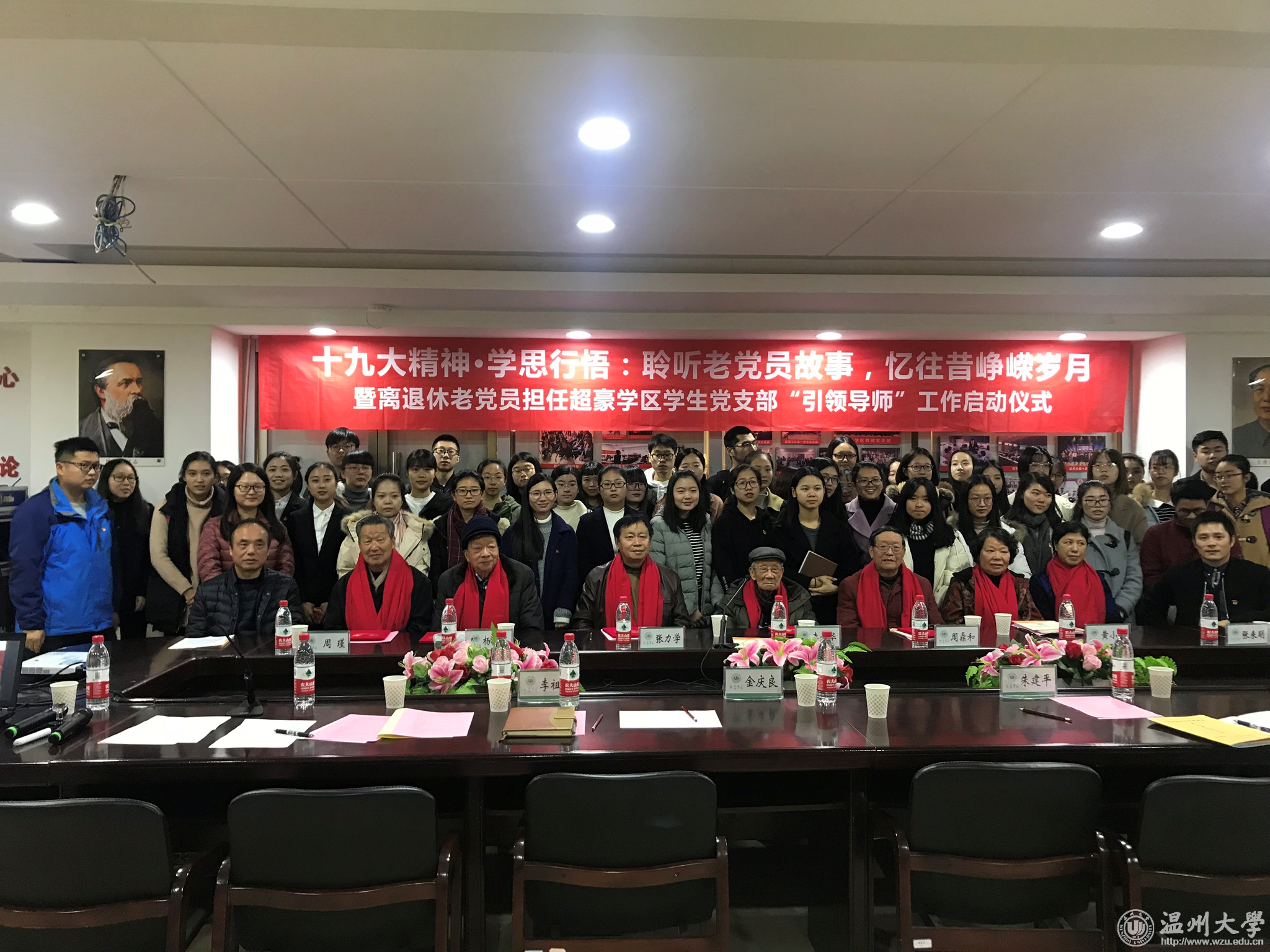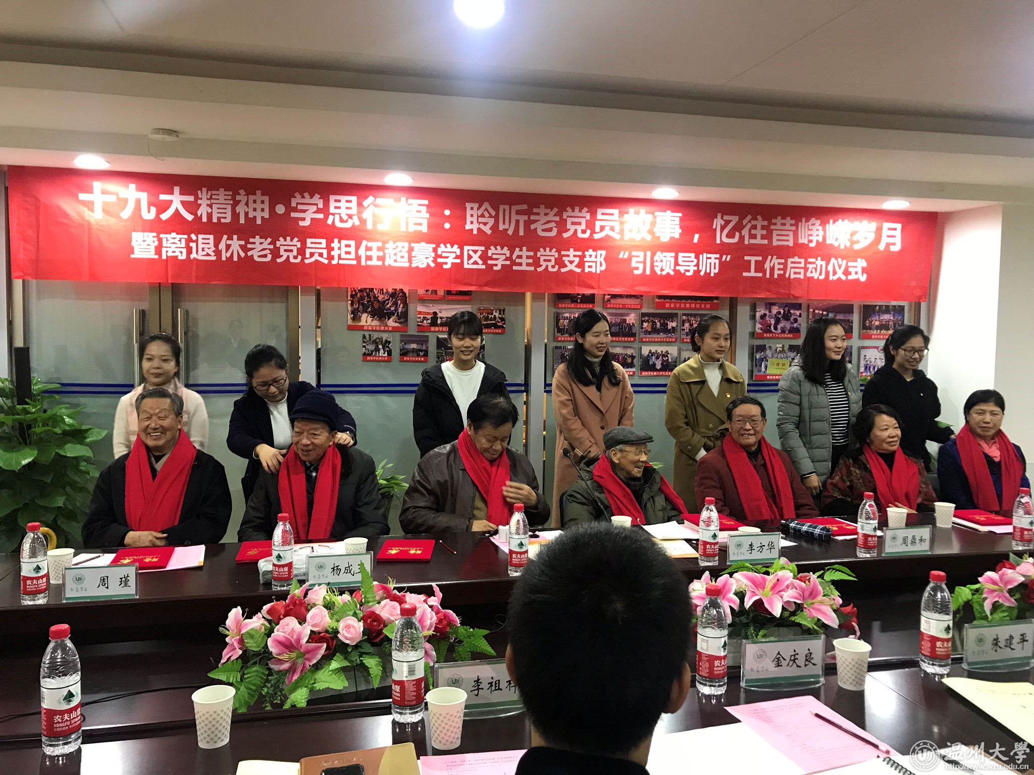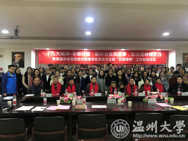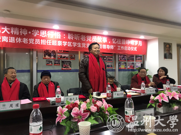 “沧海横流,十九大开启新的复兴航程,凝聚了八千九百多万党员意志,承载了全民族的期望;风云际会,十九大树起新的历史丰碑,告诫奋斗未有穷期,昭示前景更加辉煌!” 12月14日上午,离退休老党员担任超豪学区学生支部“引领导师”工作启动仪式举行,七名离退休老党员,学校有关部门、学院负责人及超豪学区全体教工党员、60余名学生党员参加仪式。仪式上,学生党员献上诗朗诵《十九大礼赞》,并为被聘为学区“引领导师”的七位离退休老党员送上鲜艳的红色围巾。窗外寒风瑟瑟,屋内温暖如春。老少党员们的心紧紧连在了一起。
