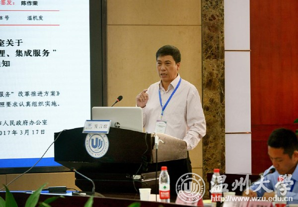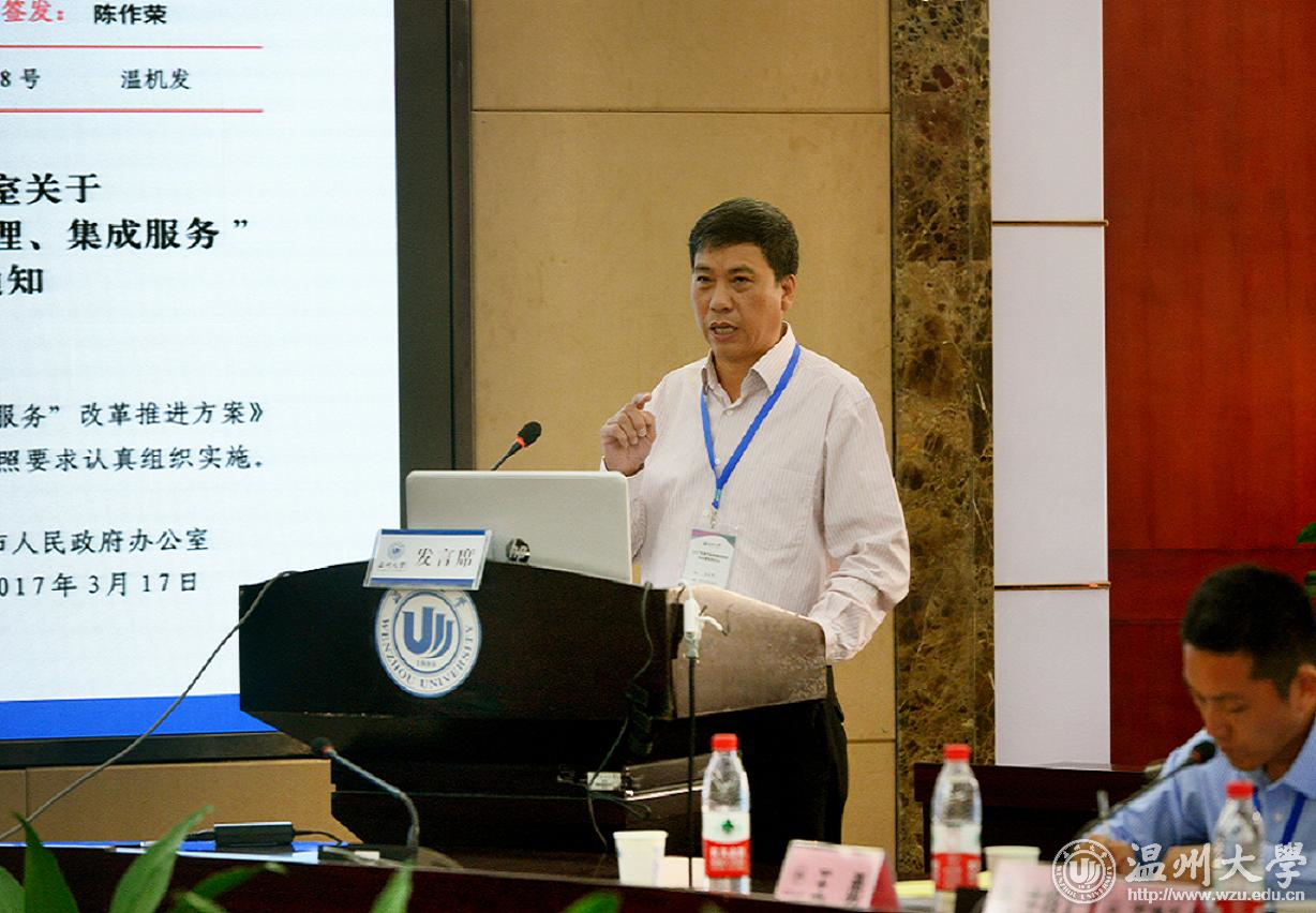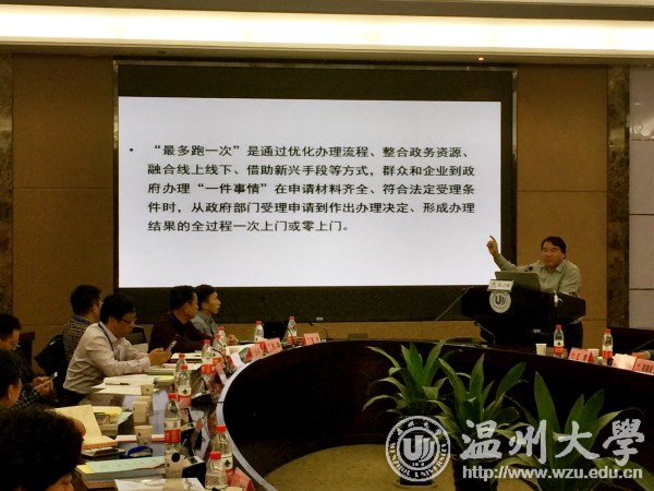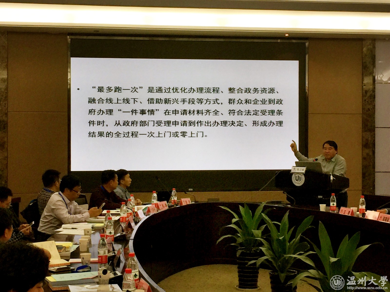 宁波大学商学院院长、浙江大学公共政策研究院副院长范柏乃教授,全国政府绩效管理研究会副秘书长、苏州大学尚虎平教授,温州市行政审批管理办公室(市公共资源交易管理委员会办公室)主任、党组书记王延申,上海交通大学中国城市治理研究院韩志明教授,苏州大学党委宣传部副部长余敏江教授,beat365官方网站地方政府绩效管理研究中心执行主任付翠莲教授分别作题为“着力处理好前行中的十大关系,将‘最多跑一次’改革进行到底”“政府潜绩评估的内容维度及评估指标的实证筛选研究”“以‘最多跑一次’为目标,深化审批制度改革”“国家治理的知识转向——以公民参与为中心的分析”“推进地方环境治理现代化的三维路径”“意义、逻辑、路径:基于‘最多跑一次’改革的分析”的发言。