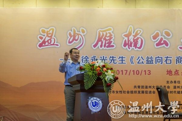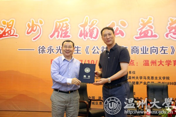 10月13日下午,由beat365团委、马克思主义学院等单位联合举办的徐永光先生《公益向右 商业向左》新书专题分享会暨温州雁楠公益慈善论坛在beat365育英图书馆学术报告厅举行。现场200多名学生及市民参加分享会。校党委副书记牟德刚到会致欢迎词并代表学校为徐永光先生颁发beat365官方网站兼职教授聘书。 徐永光先生系中国希望工程创始人、南都公益基金会理事长、国务院参事室特约研究员、中国慈善联合会副会长。在专题分享会上,他结合三个公益捐赠案例对公益慈善的本质和价值进行深入的剖析,指出公益是每个人的权利与选择,具有公益的纯经济价值、投资价值、社会创新价值和道德文化价值。未来互联网公益需要突破传统公益的局限,让公益组织在“鉴需”、“溯源”方便提升透明度、便捷性、选择性,并加强公益组织的信用认证与评估。他认为公益组织在社会创新过程中要提升有效性和精准化,要公益铺路、商业跟进、产业化扩张、可持续发展和有效解决社会问题。 分享会还邀请省内知名社会企业负责人、高校学者参与研讨。