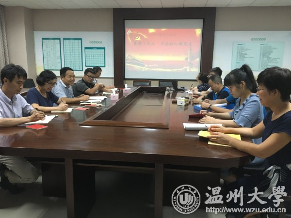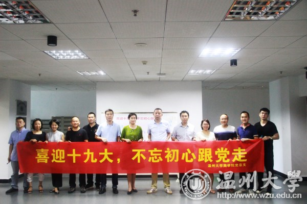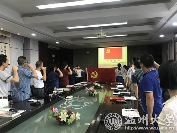 “我志愿加入中国共产党……”在洪亮铿锵的入党誓词中,机关党委第七支部全体党员紧握右拳,面向党旗,再一次重温了当年入党时的誓言。主题党日活动中,党员们集中收看了瓯海区泽雅镇唐宅村已故村党支部书记潘宝良同志学习视频《用生命践诺》。大家纷纷表达自己喜迎党的十九大的喜悦心情,抒怀党领导下祖国日新月异的巨大发展,畅想学校十三五期间的美好蓝图,就如何发挥先锋模范作用谈感想谈体会。