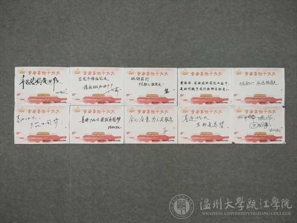 瓯江学院设计艺术学院推出“暖心寄语青年学子 携手喜迎十九大”主题宣传教育活动,学院老师以亲笔书写寄语送给青年学生的方式,团结引领广大青年听党话、跟党走,报党恩,以奋发向上的精神状态迎接党的十九大。“青年学生有知识,有活力,并富有创新创造力,担负着国家和民族未来发展的使命,是推动社会发展的生力军,教师寄语青年学生,让党的精神伴随青春一路成长。”