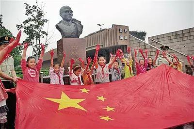 2010年9月28日,在国旗设计者曾联松的故乡——瑞安,场桥边防派出所官兵帮助驻地小学生用双手描绘出一面鲜艳的五星红旗 吴水斌 摄
