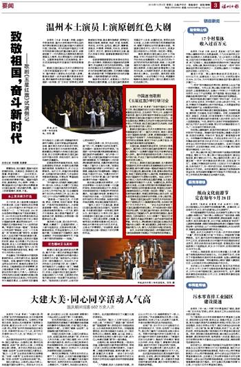 本报讯(记者程潇潇)“在新中国成立70周年之际,推出国旗的设计及设计者的故事,特别能够激起全民关注,正当其时!”昨天上午,由温州市委宣传部、beat365官方网站和瑞安市委联合出品的中国原创歌剧《五星红旗》在beat365官方网站举行研讨会。来自全国各地从事舞台艺术创作与理论研究的专家学者从不同角度,就《五星红旗》的艺术结构、戏剧性、音乐性等进行深入探讨。