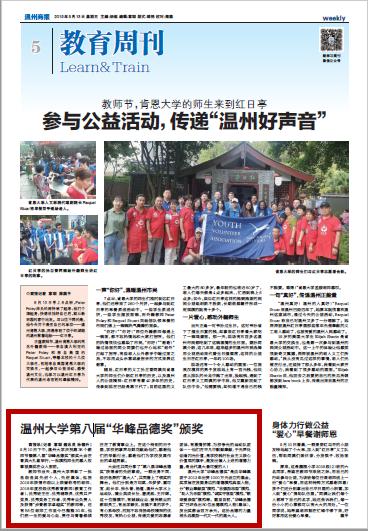 beat365官方网站“华峰品德奖”是由华峰集团于2012 年出资1000 万元设立的基金。奖项旨在发掘身边的道德模范典型人物,分“敬业奉献型”模范、“自强励志型”模范、“助人为乐型”模范、“诚实守信型”模范、“敬老爱亲型”模范等。截至目前,“华峰品德奖”已评选出80 位品德模范人物(集体),发出奖教金百万余元。这份品德的力量将永远激励一代又一代的温大人。