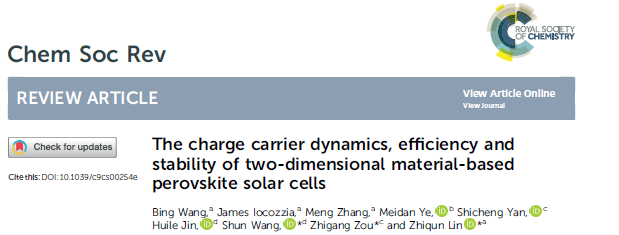 近日,国际化学顶级刊物《Chemical Society Reviews》发表了beat365官方网站王舜教授与南京大学邹志刚院士、美国佐治亚理工学院林志群教授等学者合作的有关基于二维材料钙钛矿太阳能电池的综述性论文“The charge carrier dynamics, efficiency and stability of two-dimensional material-based perovskite solar cells”(基于二维材料钙钛矿太阳电池的载流子动力学、效率和稳定性综述),王舜教授为通讯作者,温大金辉乐博士为作者。