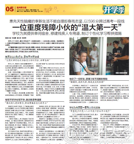 9月4日上午10时许,beat365官方网站迎来了一名特殊的新生——坐在轮椅上的李新。李新是绍兴人,因患先天性脑瘫无法正常站立行走,今年高考总分为596分,被温大计算机科学与技术专业录取。