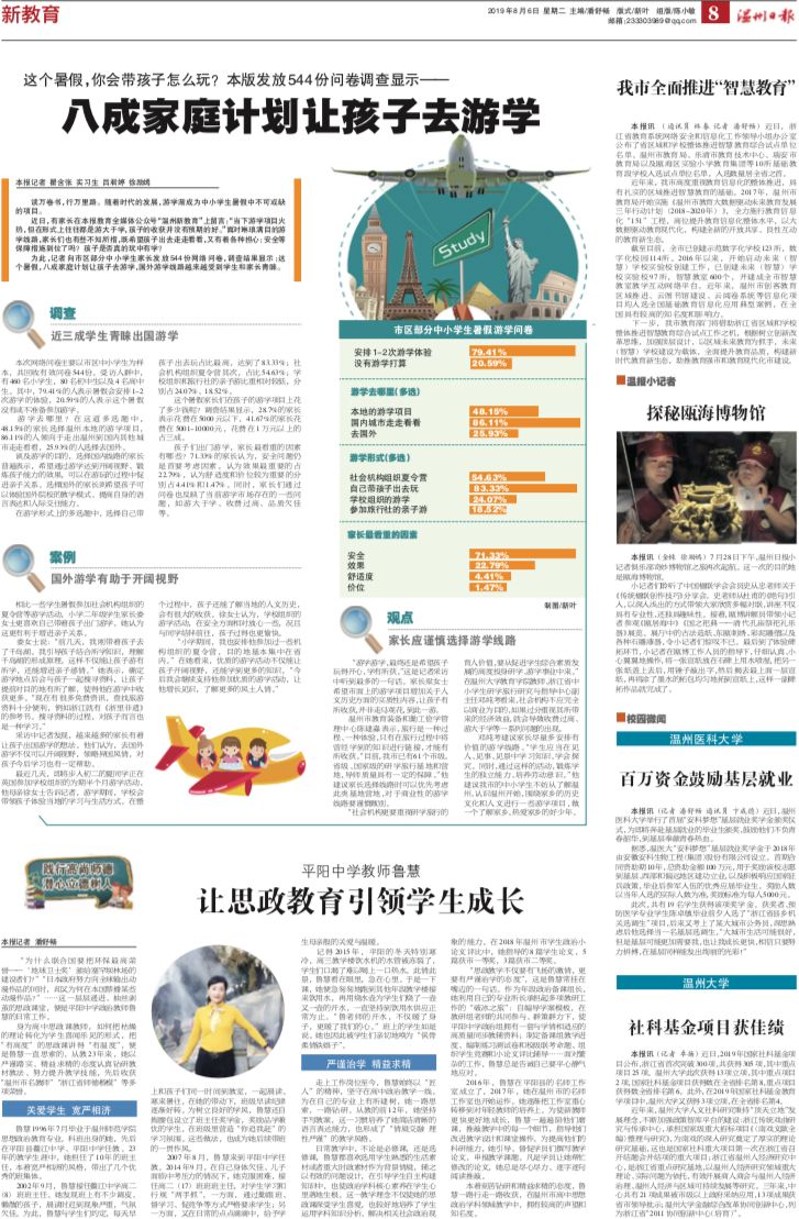 为此,记者向市区部分中小学生家长发放 544份网络问卷,调查结果显示:这个暑假,八成家庭计划让孩子去游学,国外游学线路越来越受到学生和家长青睐。