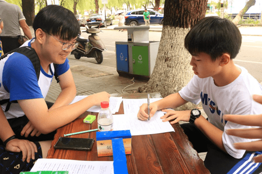 烈日当空,树影婆娑,斑驳的光影投射在树下的木桌上,跳跃在人来人往的举手投足之中,阳光下熠熠闪光的是实践队员额头细密的汗珠。这是绿向导实践队在乐清南城街道摆摊进行调查问卷的情景。这次的问卷一共两份,分别是关于水环境保护意识和民众艺术文化的调查。路过的居民纷纷参与进来,更有好心的阿姨主动呼唤同伴来填问卷。在填写问卷过程中,一位六年级男生也很认真地填问卷,在聊天中,我们得知男生应朋友邀请出来玩,尽管朋友还在别处等他,他还是愿意静下心来填这份问卷,小小的身子埋头坐在树下,十分有爱。