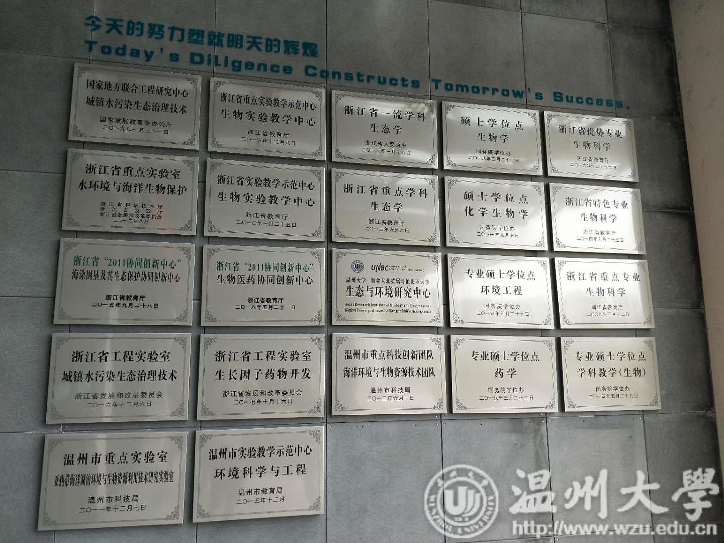浙江省水环境与海洋生物资源保护重点实验室位于beat365官方网站生命与环境科学学院内,在踏入实验室前,映入眼帘的是大门上的许多招牌,浙江省重点实验教学示范中心、生物实验教学中心、海涂围垦及其生态保护协同创新中心、浙江省“2011协同创新中心”、城镇水污染生态治理技术浙江省工程实验室、城镇水污染生态治理技术国家地方联合工程研究中心……这些招牌的最上方刻着两行中英文字:“今天的努力塑就明天的辉煌 Today's DiLigence Constructs Tomorrow's Success ”。