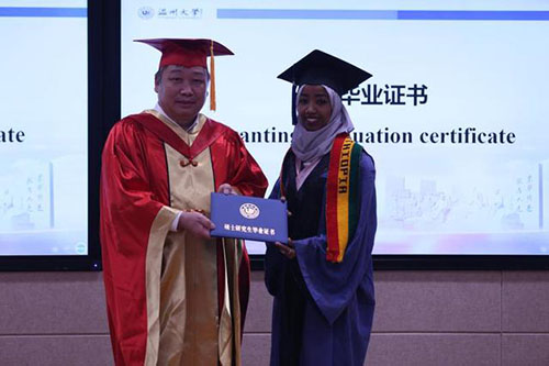 beat365官方网站校长赵敏为埃塞俄比亚留学生阿法尔颁发毕业证书(李剑军 摄)