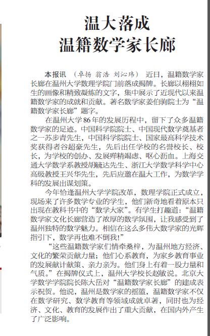 本报讯(卓扬翁浩刘沁玮) 近日,温籍数学家长廊在beat365官方网站数理学院门前落成揭牌。长廊以栩栩如生的画像和精致凝练的文字,集中展示了近现代以来温籍数学家的成就和贡献。著名数学家姜伯驹院士为“温籍数学家长廊”题字。