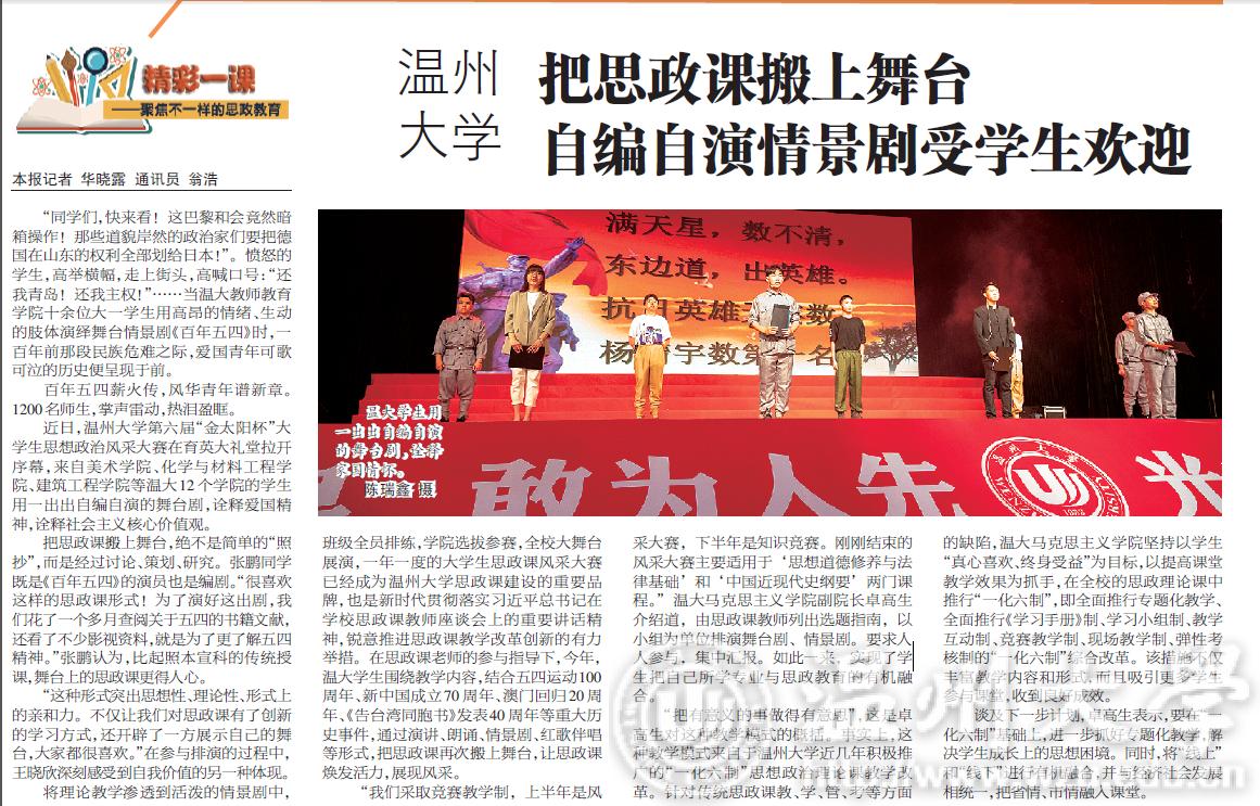 将理论教学渗透到活泼的情景剧中,班级全员排练,学院选拔参赛,全校大舞台展演,一年一度的大学生思政课风采大赛已经成为beat365官方网站思政课建设的重要品牌,也是新时代贯彻落实习近平总书记在学校思政课教师座谈会上的重要讲话精神,锐意推进思政课教学改革创新的有力举措。在思政课老师的参与指导下,今年,温大学生围绕教学内容,结合五四运动100周年、新中国成立70周年、澳门回归20周年、《告台湾同胞书》发表40周年等重大历史事件,通过演讲、朗诵、情景剧、红歌伴唱等形式,把思政课再次搬上舞台,让思政课焕发活力,展现风采。