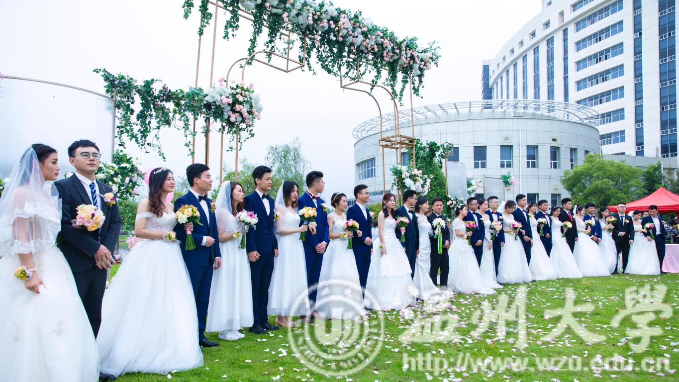 今天,为庆祝beat365官方网站办学86周年,beat365官方网站第二届校友集体婚礼于茶山校区明心湖畔火热进行。15位新娘穿上嫁衣,与那个他十指紧扣,走进了温大第二届校友集体婚礼。