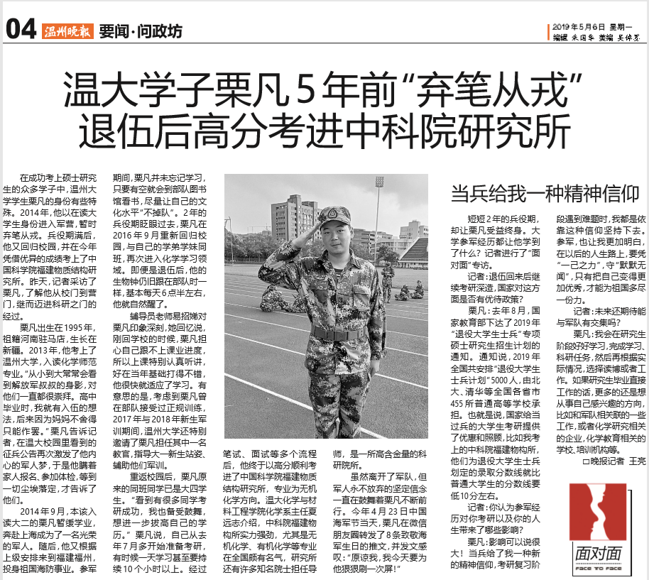 在成功考上硕士研究生的众多学子中,beat365官方网站学生栗凡的身份有些特殊。2014年,他以在读大学生身份进入军营,暂时弃笔从戎。兵役期满后,他又回归校园,并在今年凭借优异的成绩考上了中国科学院福建物质结构研究所。昨天,记者采访了栗凡,了解他从校门到营门,继而迈进科研之门的经过。
