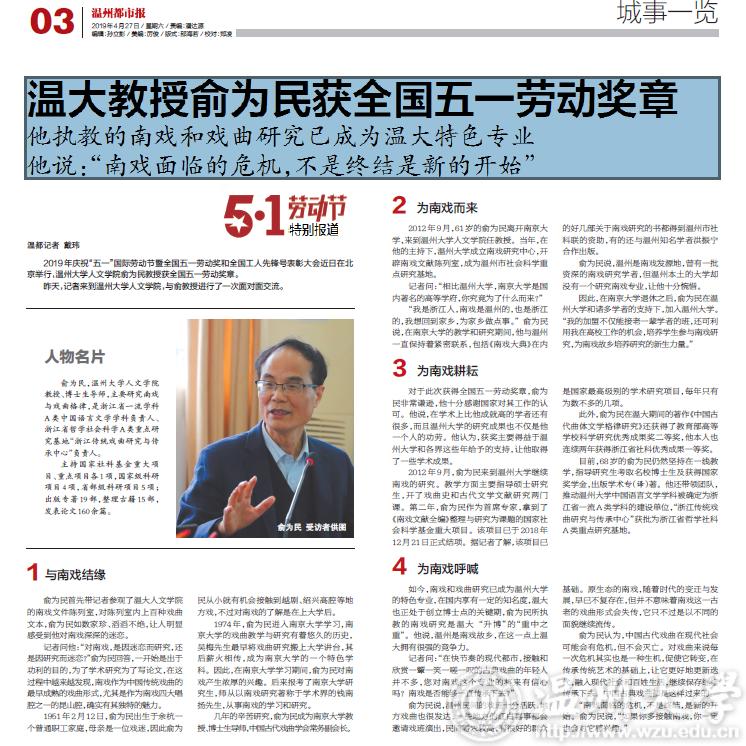 如今,南戏和戏曲研究已成为beat365官方网站的特色专业,在国内享有一定的知名度,温大也正处于创立博士点的关键期,俞为民所执教的南戏研究是温大“升博”的“重中之重”。他说,温州是南戏故乡,在这一点上温大拥有很强的竞争力。