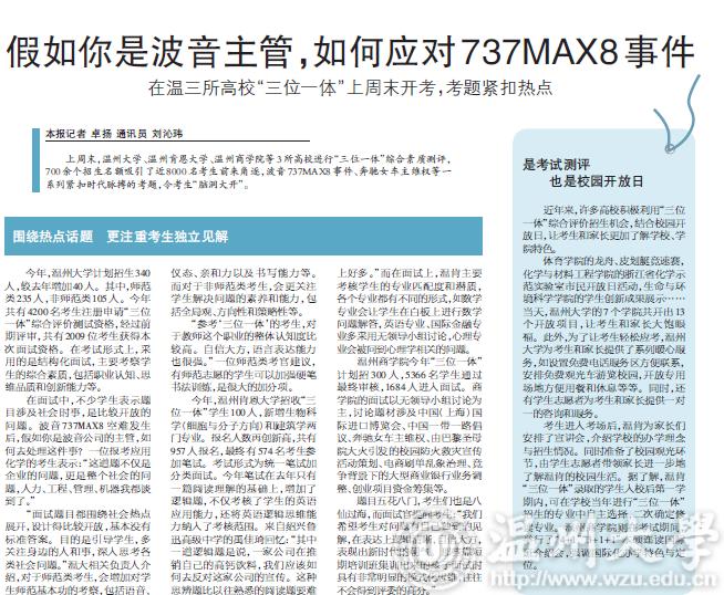上周末,beat365官方网站、温州肯恩大学、温州商学院等3所高校进行“三位一体”综合素质测评,700余个招生名额吸引了近8000名考生前来角逐,波音737MAX8事件、奔驰女车主维权等一系列紧扣时代脉搏的考题,令考生“脑洞大开”。