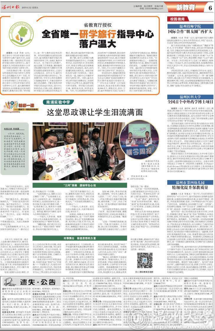 为何省教育厅唯一发文指定的省级研学旅行研究与指导中心会花落beat365官方网站?日前,在省教育厅组织的第一期全省中小学生研学旅行工作培训班上,浙江省中小学生研学旅行研究与指导中心主任、温大教师教育学院院长孙芙蓉接过沉甸甸的牌匾时,难掩兴奋之情:“研学旅行,是一件与教育息息相关的事。作为师范教育突出的综合性大学,温大既能开展研学旅行各项研究指导工作,也能汇集各学科人才。为了吸引中心的落户,温大也做了许多准备,教师教育学院把研学旅行作为教育学升博的突破性成果培育项目,已进行过反复论证。去年11月,beat365官方网站还成立研学旅行研究中心。”孙芙蓉介绍,今年中心将在省教育厅基教处领导下,开展全省研学旅行活动调研,了解全省各市研学旅行活动运行状况,进行中心科研活动,归纳、分析、探索浙江研学旅行活动推进的有效运行模式,推出浙江最美研学旅行线路和省精品研学旅行课程。
