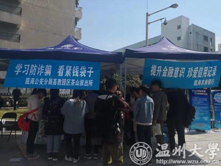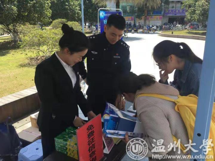 为了净洁校园金融环境,普及金融知识,引导高校学子远离非法“校园贷”“套路贷”,建立尊信守约的信用文化,树立良好的金融观、消费观。3月15日,瓯海农商银行与beat365官方网站团委、保卫处、瓯海禁毒办、茶山派出所、茶山街道等单位在温大溯初学区共同举办“益·青春”:护航新时代大学生3·15主题广场活动。活动现场设置了大学生征信免费查询、防范“套路贷”宣传咨询、金融知识宣讲、金融诈骗、消费权益保护等20余个宣传摊位。