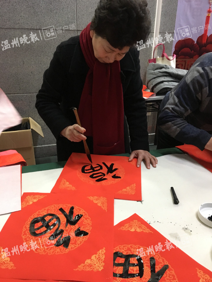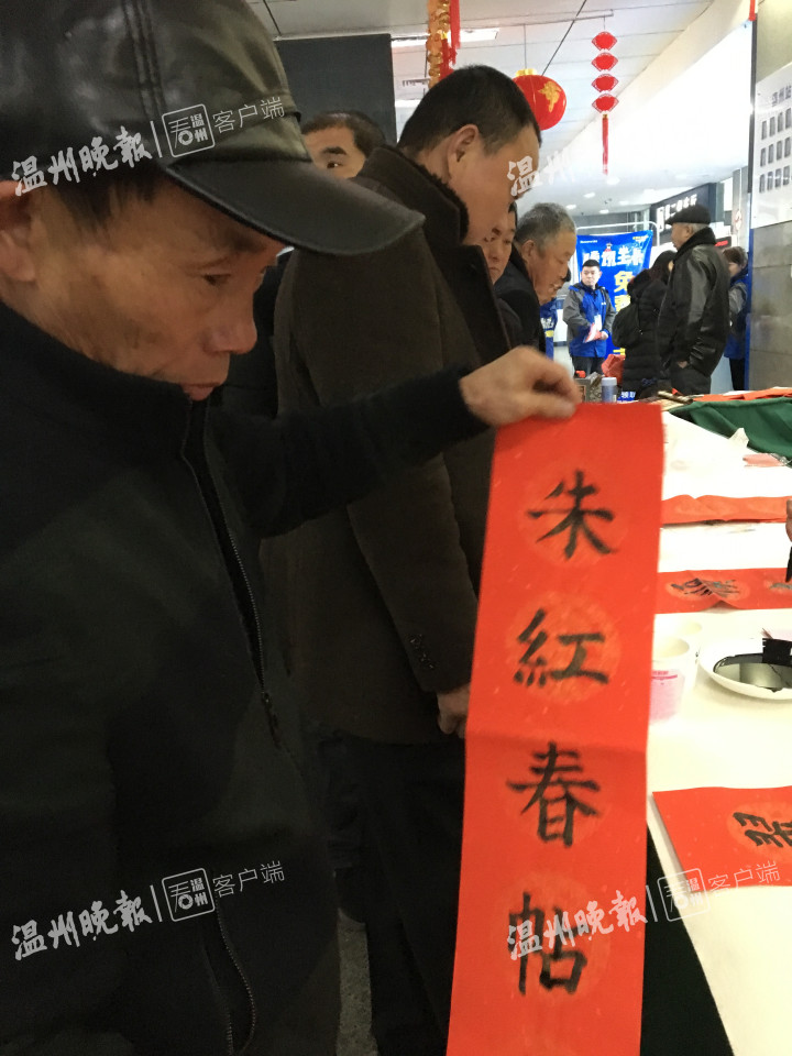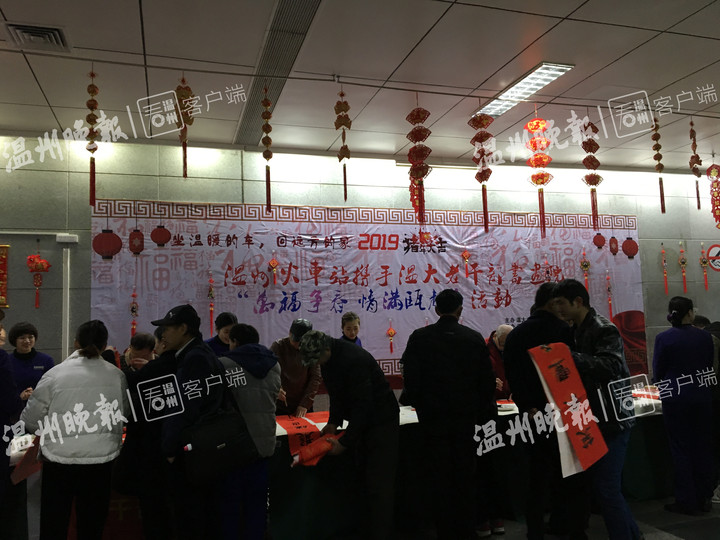 来到温州火车站候车大厅二楼,旅客们正有序地通过安检。过了安检后,就可以看到beat365官方网站老干部书画院的书画家们忙碌的身影,他们早已经在那里为旅客书写对联、福字了。农历年底,向旅客赠送福字、对联等活动,是温州火车站的传统“节目”,已经坚持了5年。在现场,记者发现十几位书画家书写的作品都很受旅客欢迎,写好没等挂出去,就被“抢夺”一空。在温州工作准备回徐州老家的姓吴的男士先是拿了一个福字,然后又等在书画家面前再要一幅对联。他说,回家过年,带个福字、带幅对联回去,有过年的气息,他感谢温州火车站推出的这项活动。送福字、对联活动持续了半天时间。