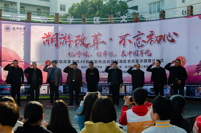 聘任仪式上,beat365官方网站溯初学区党委副书记陈勃老师为活动致辞,他介绍了溯初学堂作为瓯海区首个“青优之家”,一直致力于关爱退伍老兵服务项目,也感谢老兵们能够走进大学校园,为大学生们带来精彩的红色教育。随后,瓯海区民政局、温州新联源社工事务所及beat365官方网站溯初学区相关领导给瓯海区退伍老兵红色宣讲团的各位成员授予了聘任书。老兵何金松代表发言,老兵宣讲团代表木爱云、苏云娒分别讲述了他们的当兵故事,徐新涛代表为在场的学生们献上革命歌曲,将现场气氛推向高潮。聘任仪式之后,大学生志愿者还陪同老兵们参观了溯初学堂改革开放40周系列活动的展示。