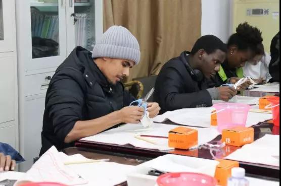 “要找出对称的地方,里面的花纹对折剪”“主要的技法是点染,基本不运笔”“桔黄色渗透能力强,要注意对水分的把控”……留学生们边听老师讲解边操作,饶有兴致地描绘蝴蝶轮廓、裁剪、点色和装饰。不一会儿,一只只五彩缤纷的“蝴蝶”便在纸上呈现。