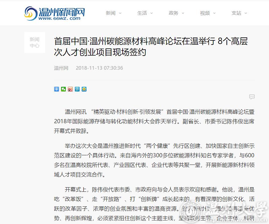 “精英驱动·材料创新·引领发展”首届中国·温州碳能源材料高峰论坛暨2018年国际能源存储与转化功能材料大会昨天举行。副省长、市委书记陈伟俊出席开幕式并致辞。