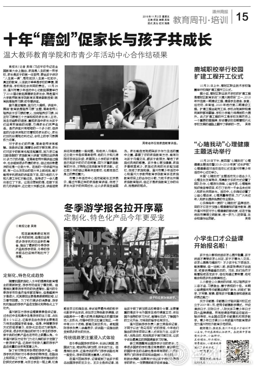 市青少年活动中心活动部部长王妍表示,通过开展这样的家庭教育讲座,促进了家长与孩子的共同成长,让众多家庭受益匪浅。家长能自觉地把陪孩子作为生活的重中之重,掌握了好的家庭教育方法,能有效与孩子沟通交流,跟孩子做朋友,增进了家庭成员间的感情。孩子身心更加健康,家庭矛盾明显减少,家庭成员间的关系越加密切,促进了家庭和谐。温州市青少年活动中心和beat365官方网站教师教育学院教育系在家庭教育项目上的合作已十载,为数千家长开展家庭教育培训,但这不是家庭教育工作的终点,而是新的起点。