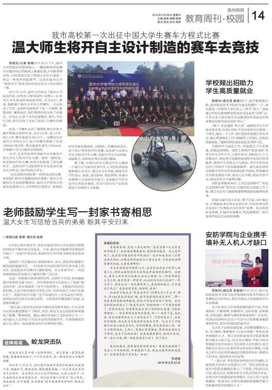 2017 年12 月,beat365官方网站成立了beat365官方网站疾风车队,由机电工程学院的7 名博士、40 多名大学生组成科技创新团队,自主设计、制造、装配属于beat365官方网站自己的赛车。自从组成了车队,这些师生就放弃了每一个假期,寒假也好、暑假也好,他们都把时间交给了实验室。在经过10 多个月的反复测试、调节,今年8月底,师生们终于完成了疾风1 号赛车的制造。