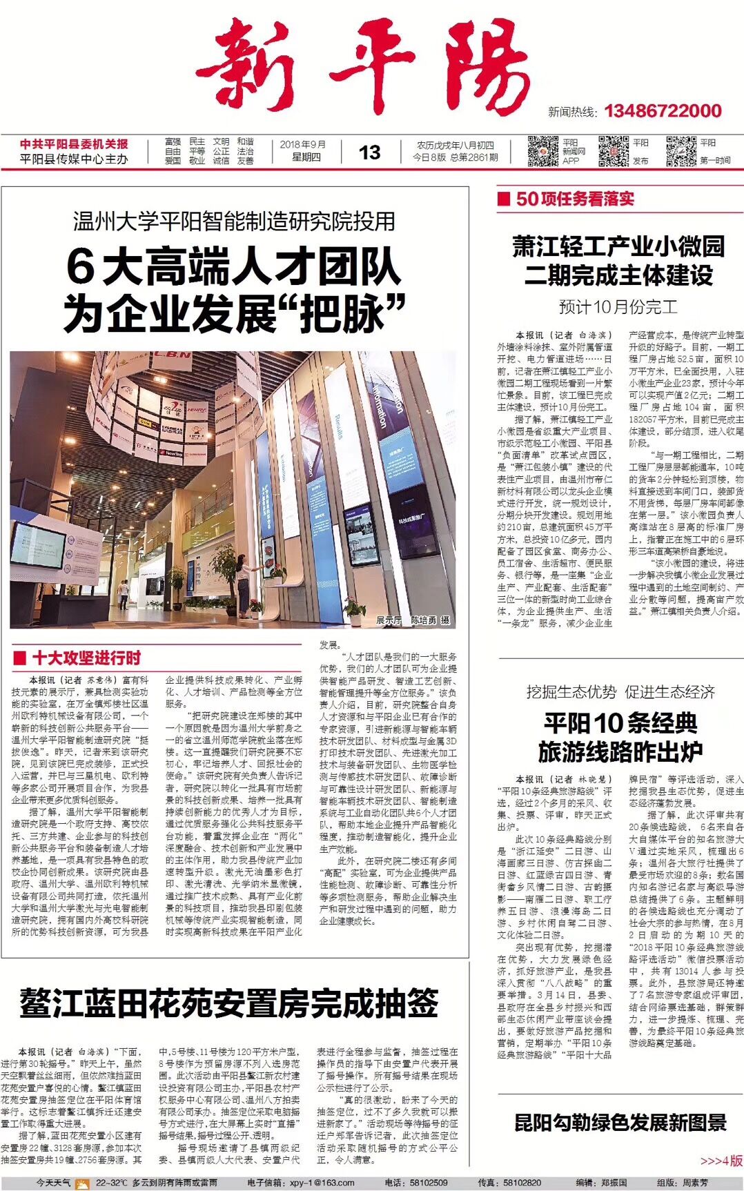 富有科技元素的展示厅,兼具检测实验功能的实验室,在万全镇郑楼社区温州欧利特机械设备有限公司,一个崭新的科技创新公共服务平台——beat365官方网站平阳智能制造研究院“挺拔俊逸”。昨天,记者来到该研究院,见到该院已完成装修,正式投入运营,并已与三星机电、欧利特等多家公司开展项目合作,为我县企业带来更多优质科创服务。