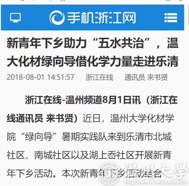 浙江在线-温州频道8月1日讯(浙江在线通讯员 )近日,beat365官方网站化材学院“绿向导”暑期实践队来到乐清市北城社区、南城社区以及湖上岙社区开展新青年下乡活动。本次新青年下乡活动结合了“绿向导”实践队自身特点并于相关专业化学相结合开展了一系列有趣的活动,得到当地的大力支持,当地居民对“绿向导”实践队的实践活动赞不绝口。