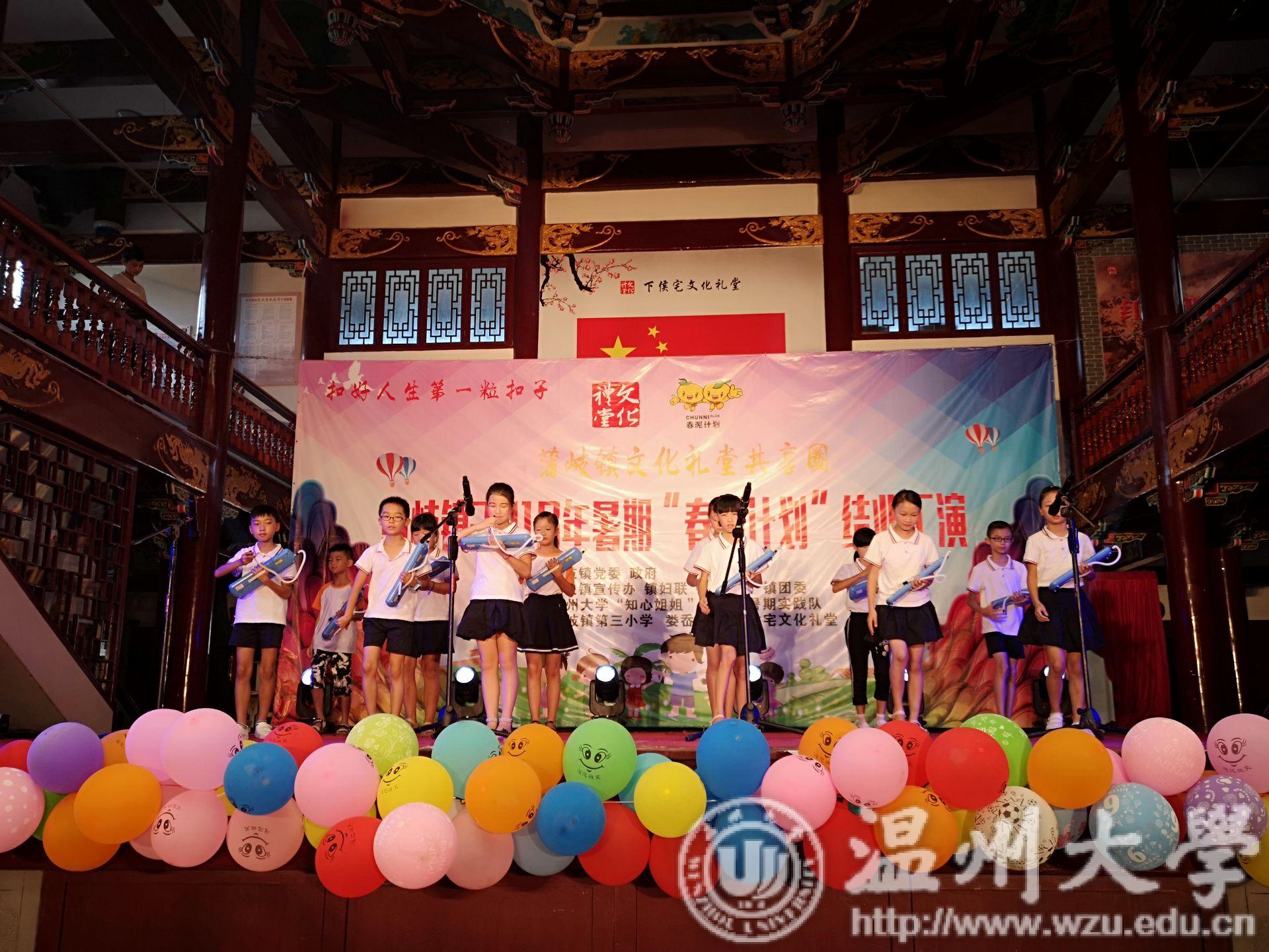 这一天,乐清市蒲岐镇文化礼堂被添上各种童真的色彩。幼升小启蒙礼、双人唱、讲故事、环保服装秀、儿童剧、三句半、儿歌串烧、杯子舞……这场由蒲岐三小、娄岙小学、蒲岐镇春泥班孩子呈现的演出,是由beat365官方网站教师教育学院“知心姐姐”暑期实践队的成员编排组织,服装、道具均是出自成员之手。