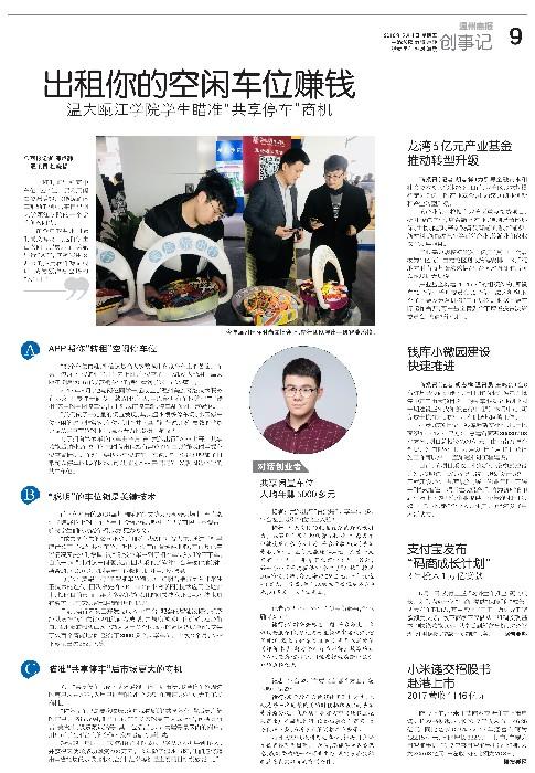 2017年6月,他与两位同学一起成立了温州美旅网络技术服务有限公司,专注于研发一款APP产品,用以帮助有车位的业主“转租”家中的空闲停车位,同时对城市停车难、停车乱起到一定缓解。