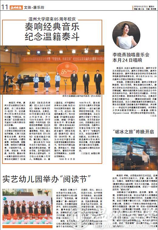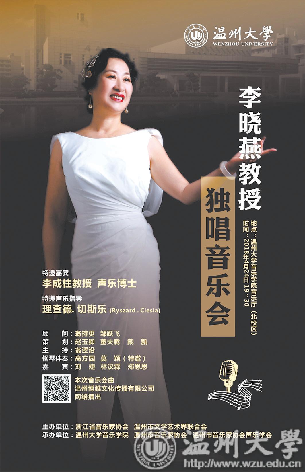 晚报讯 由浙江省音乐家协会、温州市文学 艺术界联合会主办,beat365官方网站音乐学院、温州市 音乐家协会、温州市音乐家协会声乐学会承办的 李晓燕教授独唱音乐会,将于本月24日19:30 在beat365官方网站音乐学院音乐厅唱响。 李晓燕,抒情花腔女高音,beat365官方网站音乐学 院教授,硕士生导师,音乐表演专业负责人,温 州大学声乐艺术研究所所长。此次音乐会她将用 抒情细腻,美妙优雅的歌声为我们呈现古今中外 的优秀声乐作品,其中包括古诗词歌曲、中外经 典的艺术歌曲、歌剧选曲等声乐作品,尤其是对 罗西尼的歌剧作品——《塞维利亚理发师》 的重 要唱段呈现,充分凸显高难度的花腔演唱技巧。 音乐会还邀请了旅欧著名男中音歌唱家、声乐博 士——李成柱作为特邀嘉宾联袂演唱,肖邦音乐 大学声乐歌剧学院院长——理查德·切斯乐 (Ryszard·Ciesla) 将为音乐会特邀声乐指导。