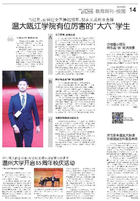 曹波是beat365官方网站瓯江学院14应用统计专业的学生,在beat365官方网站城,他也算是个“传奇人物”,当过兵、获得过2015中国体育舞蹈公开赛总决赛成人单项组R、C组L第一名,还是国际标准舞国家一级教师、一级裁判,现在他还创办了自己的舞蹈工作室,专门做小孩子的培训。对于他的“不凡经历”,学校的师生们是服气的:这个“大六”学生不简单!