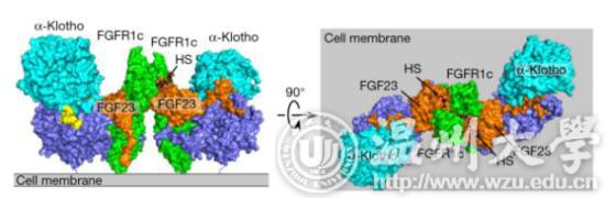 klotho-FGFR-FGF23-HS对称的四元复合物模型(图片来自nature, doi:10.1038/nature25451)