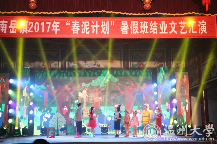 今天晚上,南岳镇春泥计划班结业汇报演出在南岳镇后塘文化礼堂火热上演。幼升小的开蒙礼、合唱、朗诵、舞蹈、越剧、儿童剧、服装走秀等11个形式多样的文艺节目赢得阵阵掌声。这场由南岳小学、南岳后塘校区春泥班孩子呈现的演出,是由beat365官方网站教师教育学院“知心姐姐”暑期实践队的成员编排组织,服装、道具均是出自成员之手。