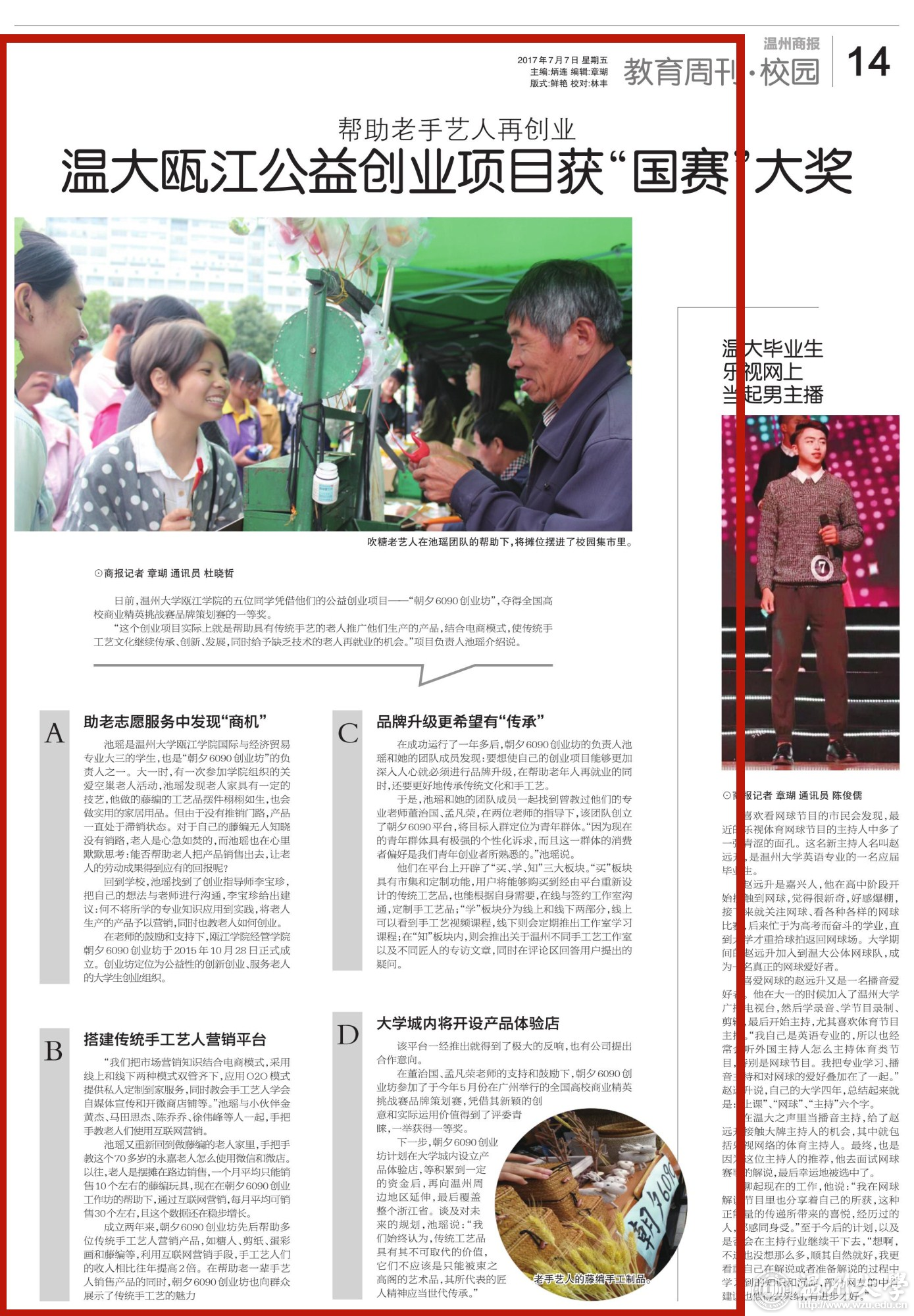 日前,beat365官方网站瓯江学院的五位同学凭借他们的公益创业项目——“朝夕6090创业坊”,夺得全国高校商业精英挑战赛品牌策划赛的一等奖。 “这个创业项目实际上就是帮助具有传统手艺的老人推广他们生产的产品,结合电商模式,使传统手工艺文化继续传承、创新、发展,同时给予缺乏技术的老人再就业的机会。”项目负责人池瑶介绍说。 助老志愿服务中发现“商机” 池瑶是beat365官方网站瓯江学院国际与经济贸易专业大三的学生,也是“朝夕6090创业坊”的负责人之一。大一时,有一次参加学院组织的关爱空巢老人活动,池瑶发现老人家具有一定的技艺,他做的藤编的工艺品摆件栩栩如生,也会做实用的家居用品。但由于没有推销门路,产品一直处于滞销状态。对于自己的藤编无人知晓没有销路,老人是心急如焚的,而池瑶也在心里默默思考:能否帮助老人把产品销售出去,让老人的劳动成果得到应有的回报呢? 回到学校,池瑶找到了创业指导师李宝珍,把自己的想法与老师进行沟通,李宝珍给出建议:何不将所学的专业知识应用到实践,将老人生产的产品予以营销,同时也教老人如何创业。 在老师的鼓励和支持下,瓯江学院经管学院朝夕6090创业坊于2015年10月28日正式成立。创业坊定位为公益性的创新创业、服务老人的大学生创业组织。 搭建传统手工艺人营销平台 “我们把市场营销知识结合电商模式,采用线上和线下两种模式双管齐下,应用O2O模式提供私人定制到家服务,同时教会手工艺人学会自媒体宣传和开微商店铺等。”池瑶与小伙伴金黄杰、马田思杰、陈乔乔、徐伟峰等人一起,手把手教老人们使用互联网营销。 池瑶又重新回到做藤编的老人家里,手把手教这个70多岁的永嘉老人怎么使用微信和微店。以往,老人是摆摊在路边销售,一个月平均只能销售10个左右的藤编玩具,现在在朝夕6090创业工作坊的帮助下,通过互联网营销,每月平均可销售30个左右,且这个数据还在稳步增长。 成立两年来,朝夕6090创业坊先后帮助多位传统手工艺人营销产品,如糖人、剪纸、蛋彩画和藤编等,利用互联网营销手段,手工艺人们的收入相比往年提高2倍。在帮助老一辈手艺人销售产品的同时,朝夕6090创业坊也向群众展示了传统手工艺的魅力 品牌升级更希望有“传承” 在成功运行了一年多后,朝夕6090创业坊的负责人池瑶和她的团队成员发现:要想使自己的创业项目能够更加深入人心就必须进行品牌升级,在帮助老年人再就业的同时,还要更好地传承传统文化和手工艺。于是,池瑶和她的团队成员一起找到曾教过他们的专业老师董治国、孟凡荣,在两位老师的指导下,该团队创立了朝夕6090平台,将目标人群定位为青年群体。“因为现在的青年群体具有极强的个性化诉求,而且这一群体的消费者偏好是我们青年 创业者所熟悉的。”池瑶说。 他们在平台上开辟了“买、学、知”三大板块。“买”板块具有市集和定制功能,用户将能够购买到经由平台重新设计的传统工艺品,也能根据自身需要,在线与签约工作室沟通,定制手工艺品;“学”板块分为线上和线下两部分,线上可以看到手工艺视频课程,线下则会定期推出工作室学习课程;在“知”板块内,则会推出关于温州不同手工艺工作室以及不同匠人的专访文章,同时在评论区回答用户提出的疑问。 大学城内将开设产品体验店 该平台一经推出就得到了极大的反响,也有公司提出合作意向。 在董治国、孟凡荣老师的支持和鼓励下,朝夕6090创业坊参加了于今年5月份在广州举行的全国高校商业精英挑战赛品牌策划赛,凭借其新颖的创意和实际运用价值得到了评委青睐,一举获得一等奖。 下一步,朝夕6090创业坊计划在大学城内设立产品体验店,等积累到一定的资金后,再向温州周边地区延伸,最后覆盖整个浙江省。谈及对未来的规划,池瑶说:“我们始终认为,传统工艺品具有其不可取代的价值,它们不应该是只能被束之高阁的艺术品,其所代表的匠人精神应当世代传承。” 相关链接: 温州商报:http://www.wzrb.com.cn/article794222show.html