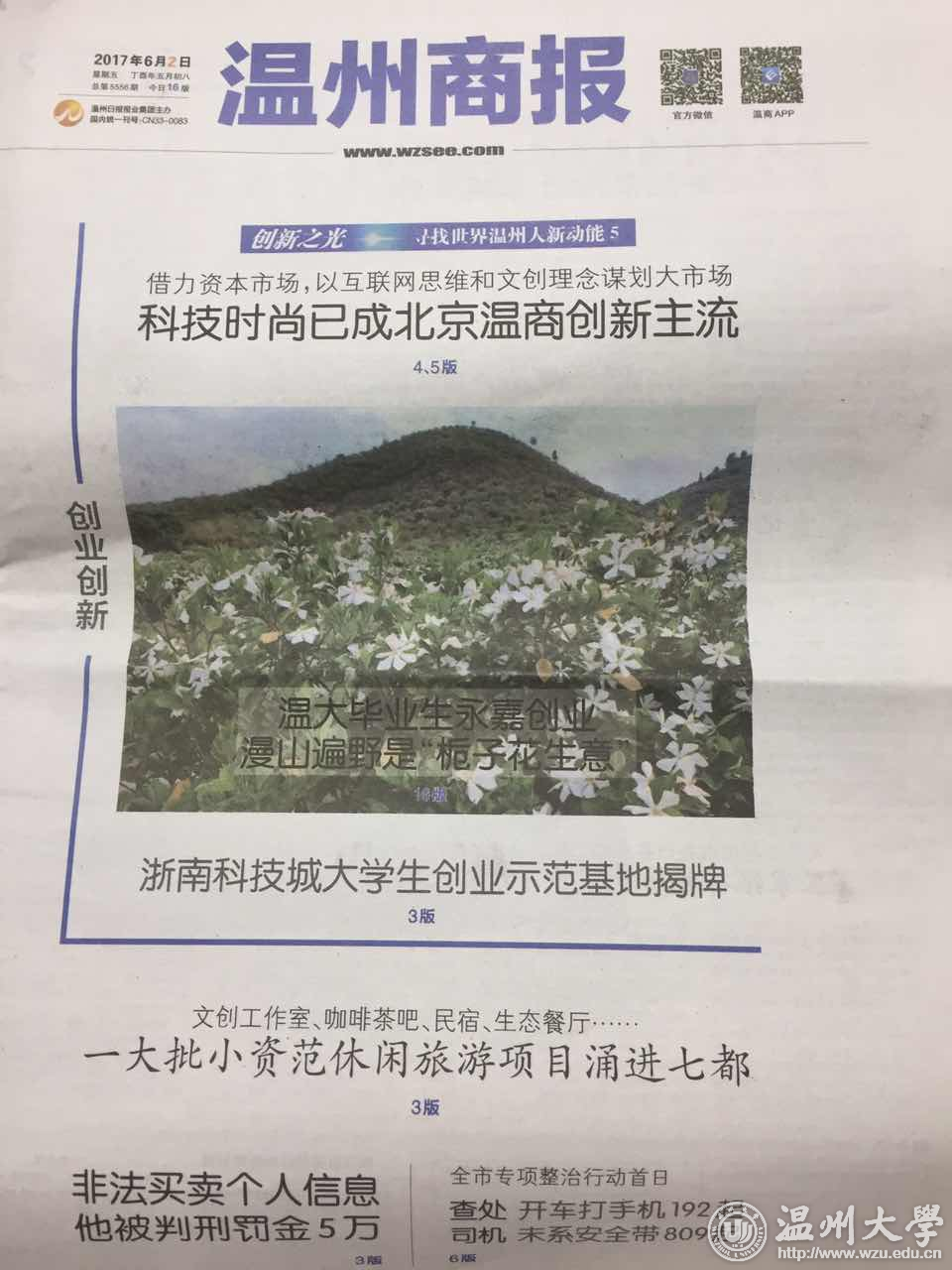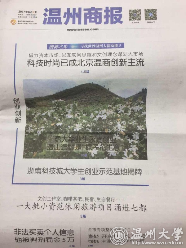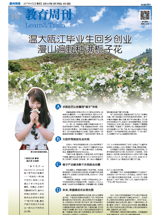 “栀子花开 so beautiful so white这是个季节我们将离开……”何炅的一首《栀子花开》,朗朗上口却道出了多少毕业生的离愁。而最近,在栀子花飘香的时节,beat365官方网站瓯江学院的一名应届毕业生却回乡做起了“栀子花”生意,靠生产栀子花相关产品闯出一条与众不同的创业之路。