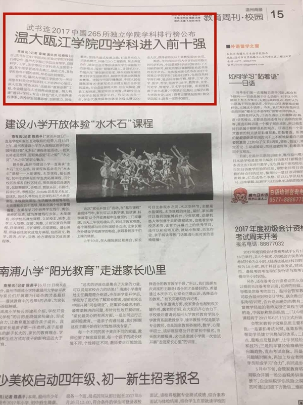 近日,武书连2017中国265所独立学院学科排行榜公布,beat365官方网站瓯江学院共有理学、自然科学、工学、法学等四个学科进入全国前十强,其中理学更是排名第三,除此之外,其他学科也有不错的表现,排名也比较靠前。 近年来,beat365官方网站瓯江学院作为一所应用型本科独立学院坚持人才培养中心地位,深入实施“特色本科”战略和“教育创新”工程,专业建设与人才培养成效显著。努力构建'通识+学科+专业+特色'的人才培养课程体系,培养学生创意思维、创新能力、创业素质;坚持内涵式发展之路,打造多元化人才培养模式,开展CDIO工程教育,校企深度合作,班级企业化等形成强化学生实践能力的新模式;设有“智能机器人、计算机DIY、节能汽车”等创新实验室,每年划拨专项经费支持学生创新项目,鼓励学生参加各级各类赛事。学院与中国华峰集团、中国人民电器集团等70多家知名企业建立校企合作实践基地;开办企业接班人班、创业先锋班、微软工程师班、淘宝网创业班等,搭建校企合作的学生就业创业平台。仅仅2016年一年,学生代表学院参加各类各级比赛2200余人次,获得省级及以上竞赛奖项90余项。 据悉,作为我国研究大学评价时间最长的科研机构,中国管理科学研究院进行了不间断的研究,研究结果以课题组组长武书连的名字命名。本次发布的《武书连2017中国独立学院学科门类排行榜》,包括自然科学排行榜、社会科学排行榜,理学、工学、农学、医学、哲学、经济学、法学、教育学、文学、历史学、管理学、艺术学排行榜。所有资料源于武书连著、中国统计出版社出版的《挑大学选专业—2017高考志愿填报指南(独立学院版)》,具有一定的权威性。 来源:2017年5月12日《温州商报》第15版(教育周刊)