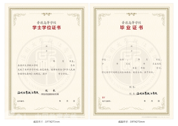 毕业证书和学位证书内芯均采用温馨的浅黄色,底纹是圆形的院标,毕业证书从上到下依次为本人两寸彩照和毕业生基本信息以及院长签名,底部是证书编号和日期等;而学位证书从上到下依次为本人两寸彩照、学位证获得者主要学位授予信息和学位评定委员会主席的签章,底部是学位证书编号和学位授予日期。 为方便学生求职、出国留学等,新版学位证书采用竖版A4尺寸,便于携带、复印与展示,同时更显美观大方。 据悉,beat365官方网站瓯江学院新版毕业证书和学位证书既新颖而庄重、典雅而清新,体现了学院的文化与传承,融入了充满温馨回忆与纪念意义,充分体现了学院“厚德浚智,学成致用”的育人理念和学院勇于创新,与时俱进的精神。