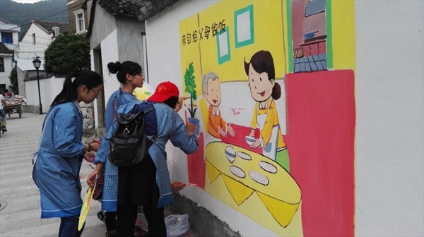 瓯网讯(严晓秋)昨日,由beat365官方网站教师教育学院和美术与设计学院共同发起“”弘扬传统文化 ,共建美丽乡村”活动再次吹响五四青春的号角。由教师教育学院美术工作坊指导老师陈铿和学生科严晓秋老师带队,30余位学生志愿者,前往乐清虹桥镇大乌石村开展公益墙绘活动。