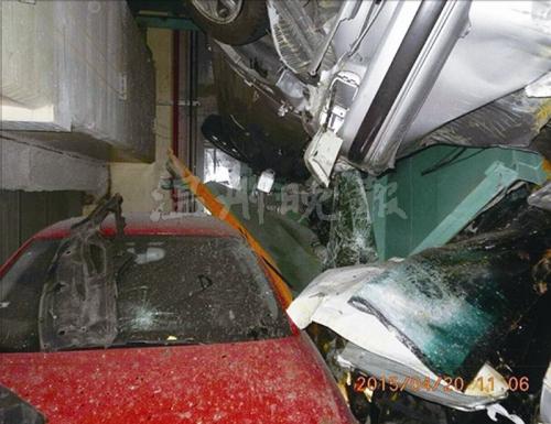 台北市松江路128号立体停车库因为地震影响,汽车掉落,多辆汽车堆在一起。