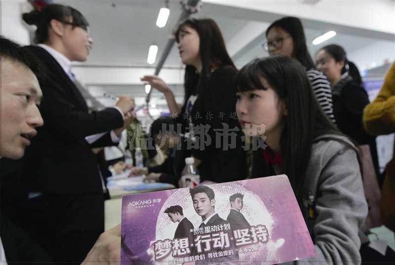 展会上,一些企业还打起了“明星”牌。奥康集团的展位前应聘者络绎不绝,排起了长队。一名女大学生说,她是因为“都教授”而来。原来,在奥康集团展位投递简历都能拿到一张印着“都教授”的宣传卡片,这张卡片又类似选秀活动的“pass卡”,凭此可以进入该公司的初试。